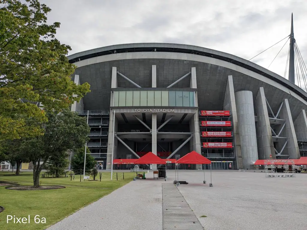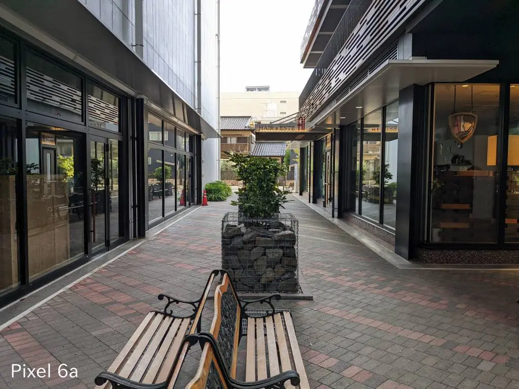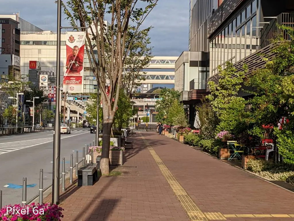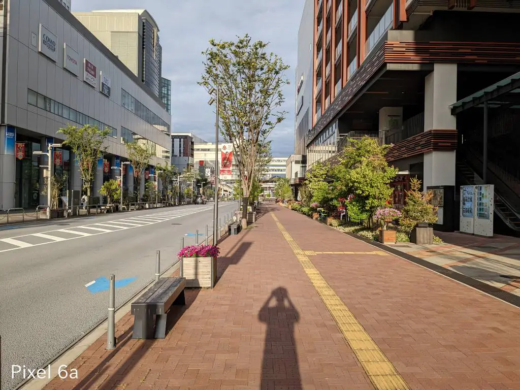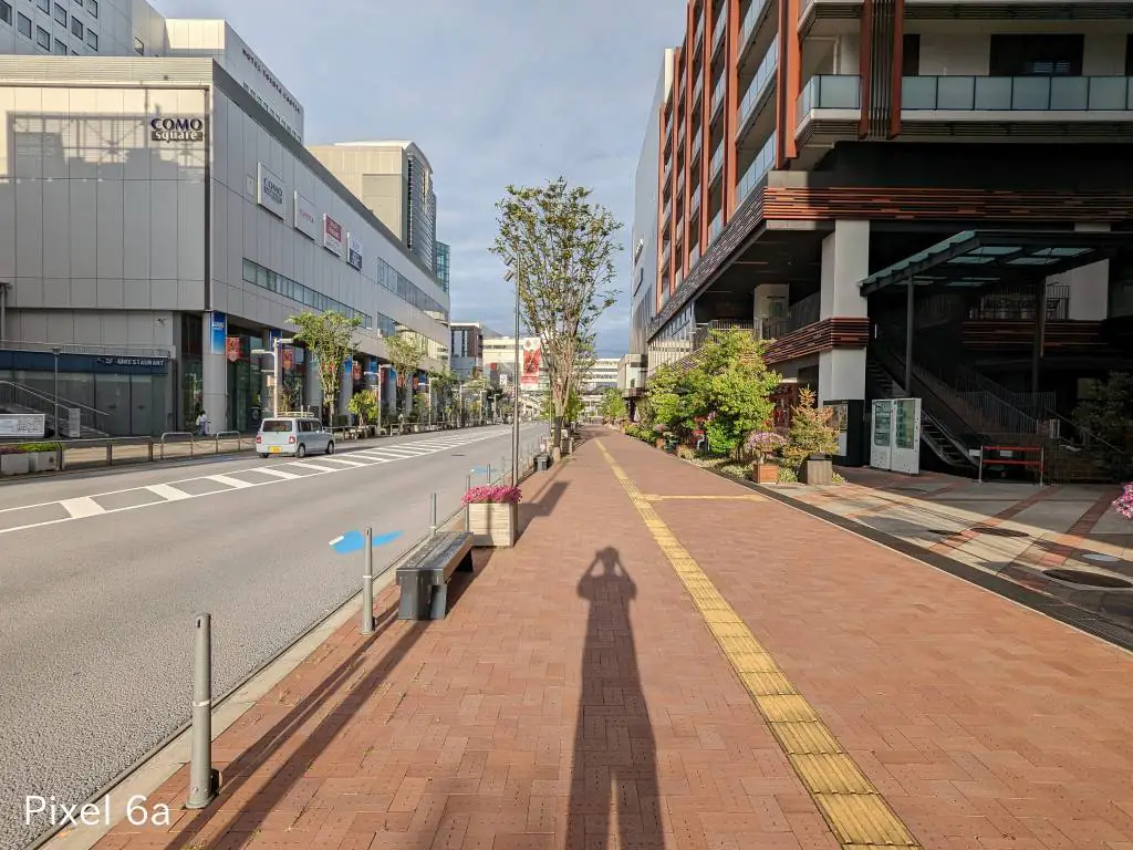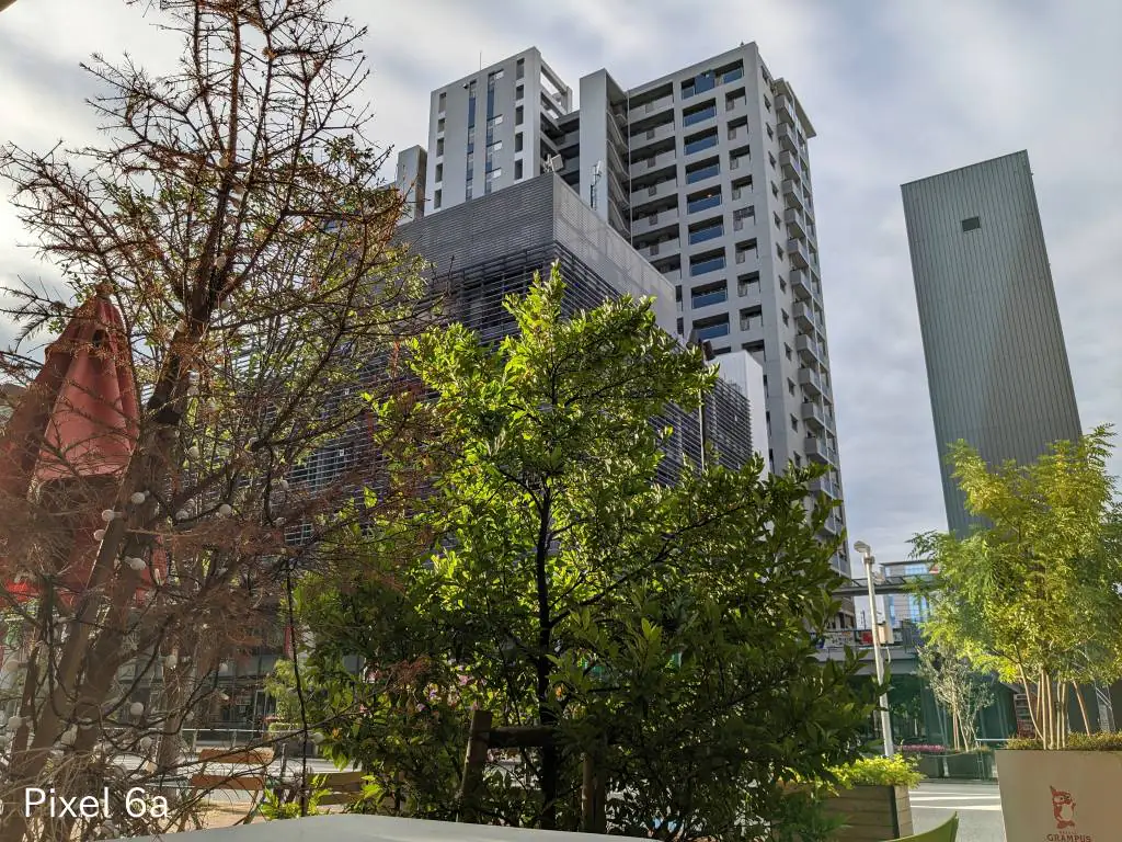 この写真も同じ傾向。iPhoneはセンサーサイズが大きいから光を取り込みすぎる影響で明るい部分の色補正が微妙になりがち。Pixel 6aは左上の屋根がバグっています。