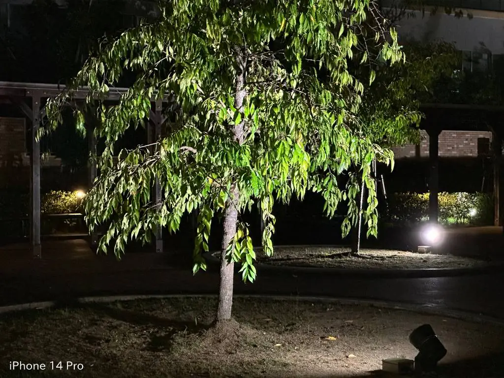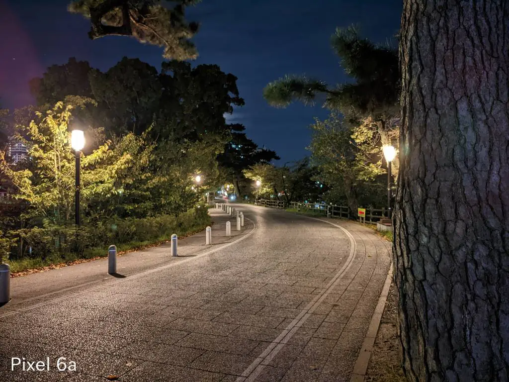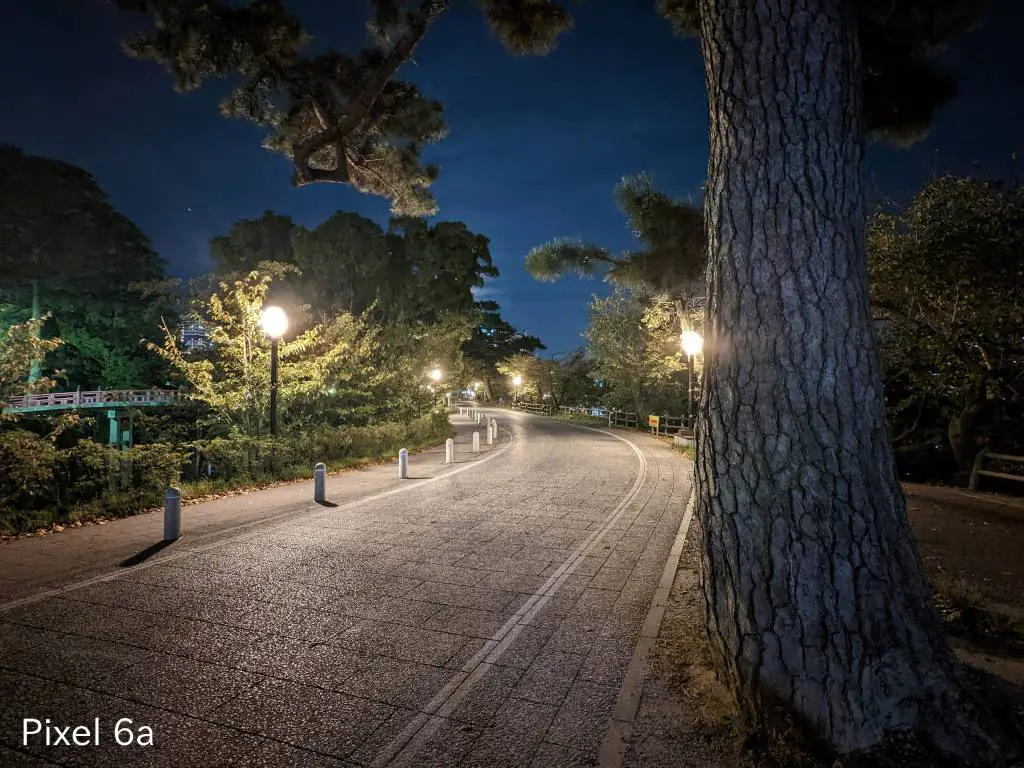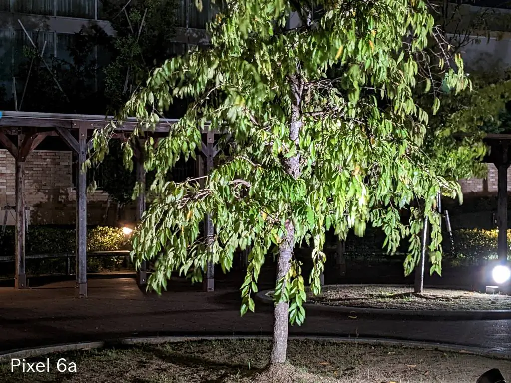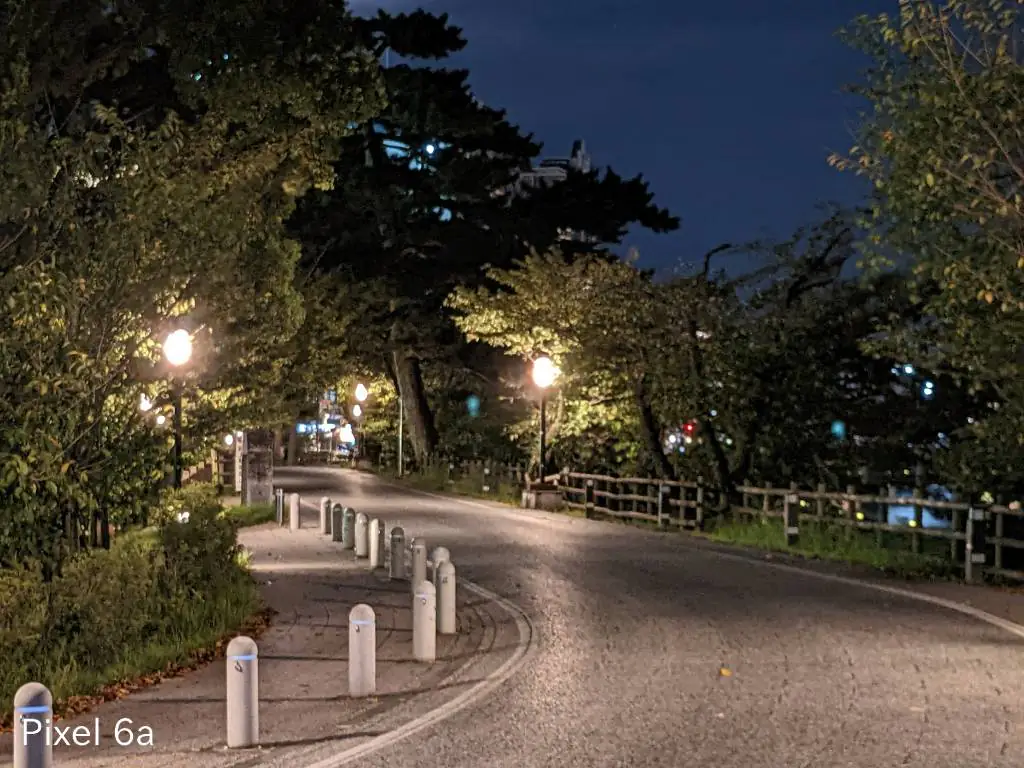 超低照度での撮影。どちらも街灯の光でゴーストが写り込んでいますがiPhoneはまだ抑えられている感じ。Pixel 6aでは潰れてしまっている樹木もiPhoneでは繊細さを残しています。