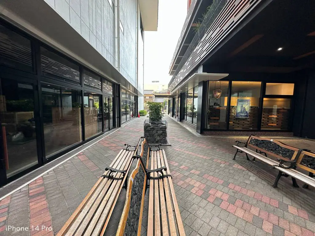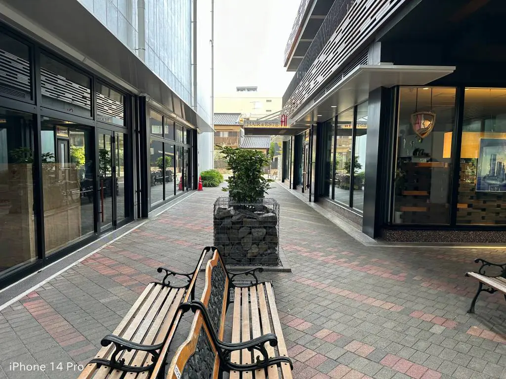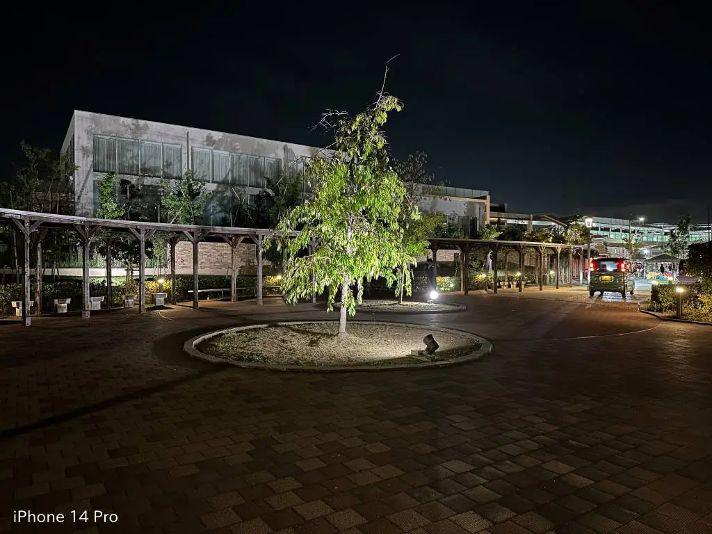 続いて夜景での撮影。iPhone14Proはタイル表面のデコボコが見えるぐらい明るくて繊細。Pixel 6aは全体的に暗くスッキリしない写真に仕上がりました。
