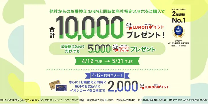 イオンモバイルは5月31日まで【春の乗り換えキャンペーン】を開催していて、MNP転入と音声プラン契約で5,000WAONポイントが還元されます。